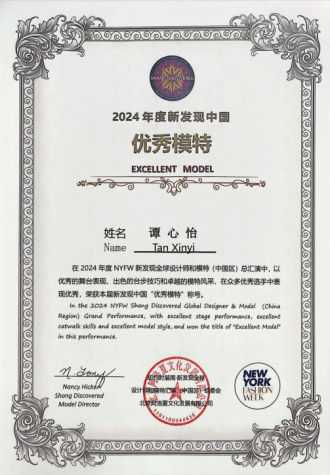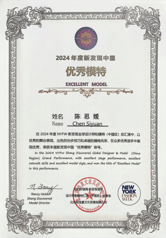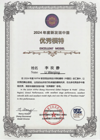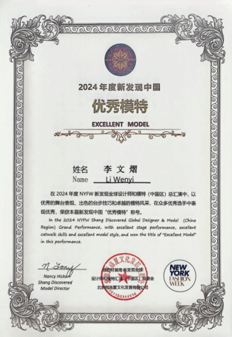 2024年度NYFW新发现中国“优秀模特”获奖证书