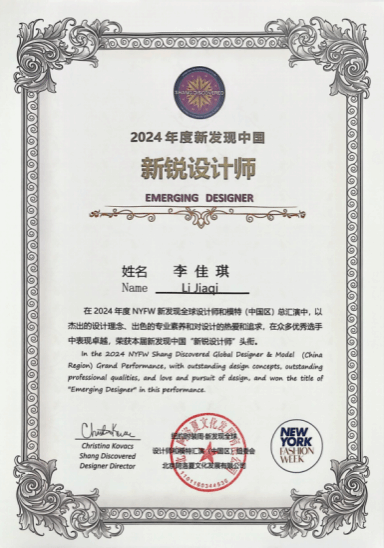 2024年度NYFW新发现中国“新锐设计师”获奖证书