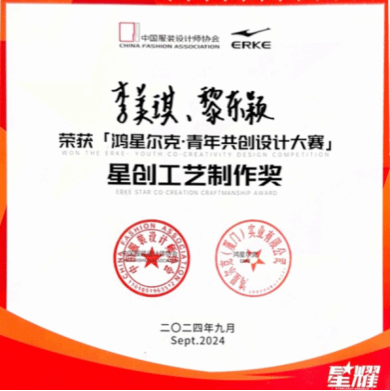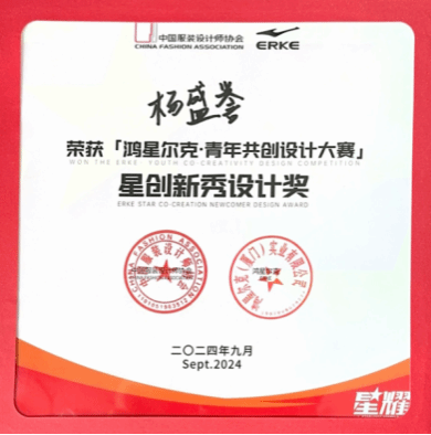 在刚刚落幕的“2024鸿星尔克·青年共创设计大赛”中,2022级服装与服饰设计专业李美琪同学荣获星创工艺制作奖,2021级服装与服饰设计专业杨盛誉同学荣获星创新秀设计奖。他们的设计作品充满无限想象力,展现了中国设计新锐力量对于运动在不同环境下功能与创新的理解,诠释了未来运动时尚的多样性与包容性。