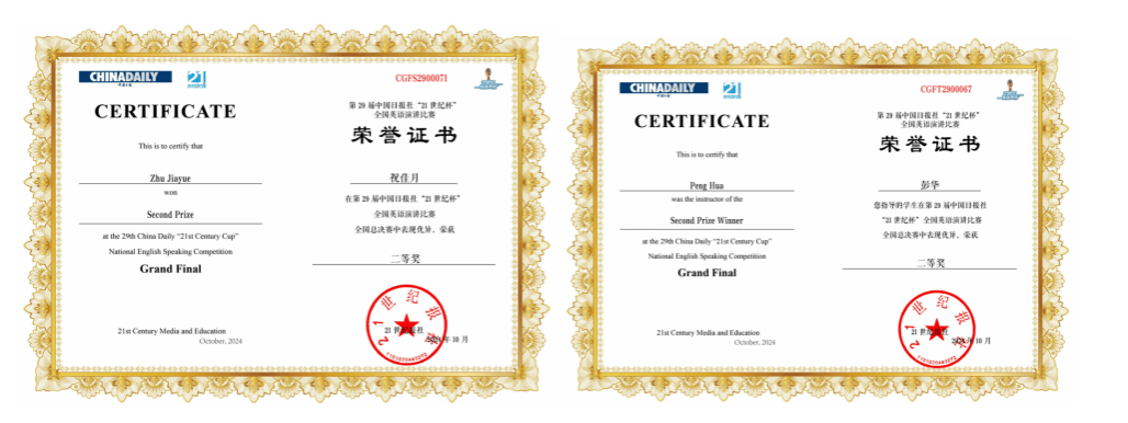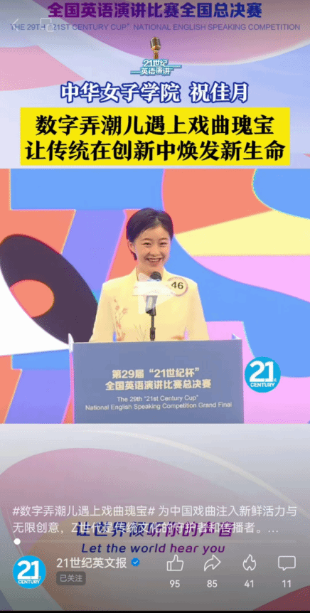 10月21日,第29届中国日报社“21世纪杯”全国英语演讲总决赛在江苏无锡落下帷幕。我校2022级播音与主持艺术专业学生祝佳月,经过激烈角逐,斩获全国总决赛二等奖。