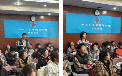 在法学院模拟法庭实验室,法学院副院长周晓雯组织中学生和我校法学院学生同上一堂课。中学生观看了谢芳、林海伟两位教师主讲的民事、刑事案件模拟开庭并参与互动,课堂上认真听讲并做笔记,在课程最后围绕案情、审理程序等问题进行提问,与法学院师生积极交流,感受了庭审氛围,学习了公诉人、辩护人、审判员的职能以及回避制度、证据类型等法律知识。
