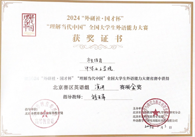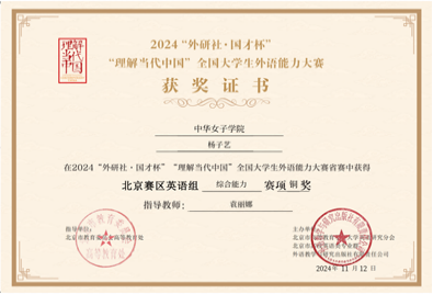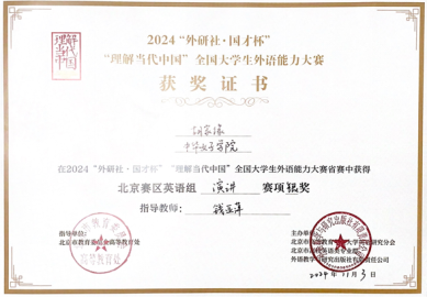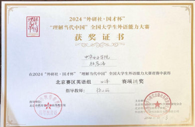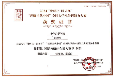 2024年12月9日,2024“外研社·国才杯”“理解当代中国”全国大学生外语能力大赛国赛在北京落幕。我校派出18名选手参赛经过激烈角逐,国际教育学院钱亚萍老师指导的播音与主持艺术专业本科生祝佳月和会计学专业本科生胡家缘喜创佳绩,分获英语组国际传播综合能力赛项国赛铜奖、演讲赛项北京市金银奖,其他同学获北京市铜奖,国际教育学院英语教学团队的7名教师获“优秀指导教师”荣誉。