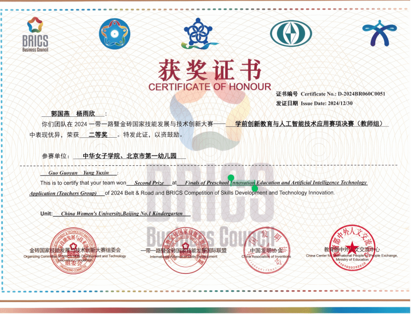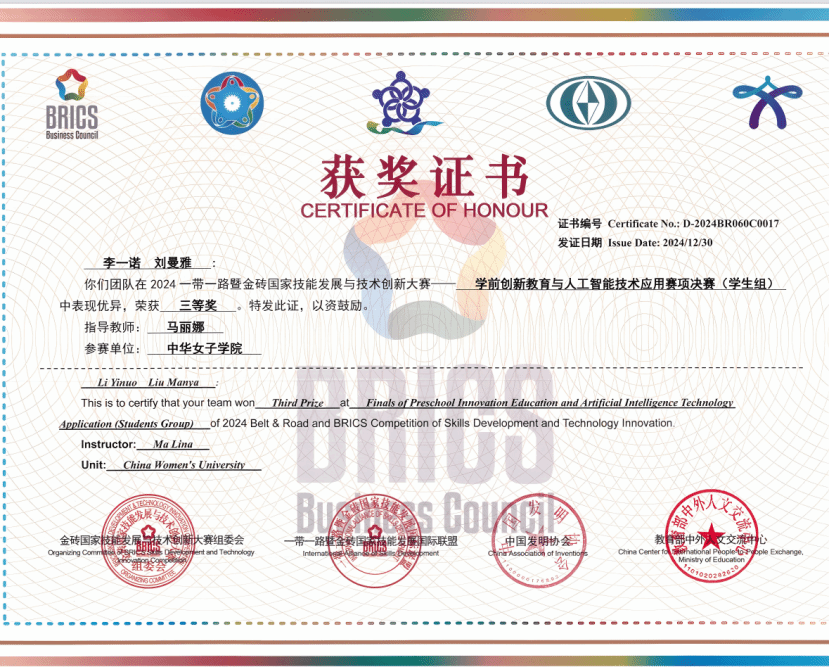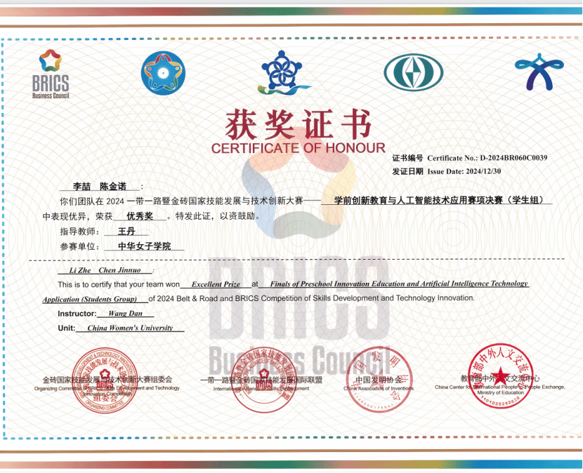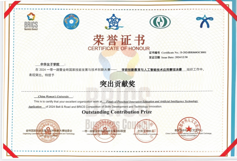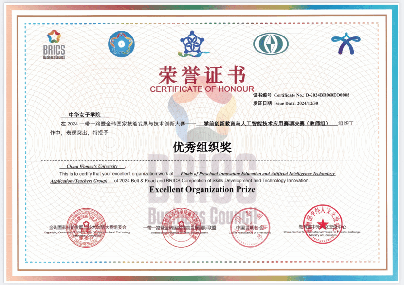 2024年12月27日至29日,由金砖国家工商理事会中方理事会、一带一路暨金砖国家技能发展国际联盟、中国发明协会、教育部中外人文交流中心等单位主办的“2024一带一路暨金砖国家技能发展与技术创新大赛之首届学前创新教育与人工智能技术应用赛项全国总决赛”在中华女子学院圆满落幕。本次大赛以促进技能发展和技术交流、加快技能人才培养为目标,吸引了众多高校和教育机构参与。大赛内容涵盖综合知识测评、技术应用实操考核以及创意制作与答辩等多个环节,全面考查了参赛选手的专业素养和创新实践能力。中华女子学院在此次大赛中成绩斐然,斩获多个重要奖项。