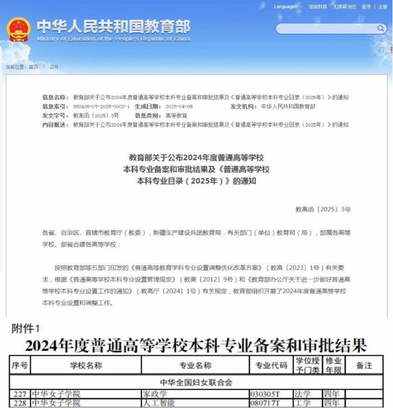 近日,教育部印发《关于公布2024年度普通高等学校本科专业备案和审批结果的通知》(教高函〔2025〕3号),我校申报的家政学专业、人工智能专业均成功获批。截至目前,我校本科专业总数达到20个,涵盖法学、教育学、管理学、经济学、文学、艺术学、工学7个学科门类。