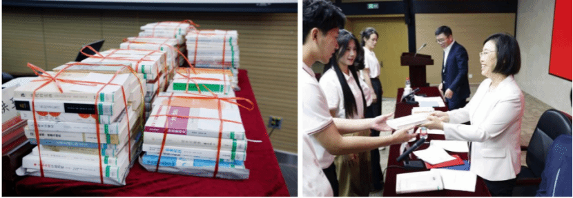 书香润心、知识赋能。典礼中特别设置了“哲思润新·文史伴行:首书借阅”的特殊环节。为助力同学们开启学术探索之旅,学校图书馆精心为每位新同学准备了首本借阅书籍。新生代表从校领导和图书馆馆长、教务部部长手中接过的首本借阅书,寄托了老师们的殷切期望,希望同学们多读书,读好书,广博学识,涵养心性,在书海中汲取智慧与力量。