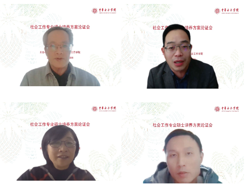 为结合新时期社会工作发展要求,提高我校社会工作专业办学水平,改善专业与课程体系构架,提高人才专业知识素养和技术能力,社会工作学院于2022年12月28日下午召开了社会工作专业硕士培养方案论证会。出席此次论证会的专家有中国人民大学社会与人口学院冯仕政教授、厦门大学社会与人类学院童敏教授、武汉大学社会学院慈勤英教授、华中师范大学社会学院郑广怀教授。中华女子学院副院长周应江教授、社会工作学院院长李敏教授、管理学院院长侯典牧教授、社会工作学院研究生教研室主任李洁教授以及社会工作学院、管理学院、妇女发展学院、文化传播与艺术学院的教师参加了会议。会议由中华女子学院副院长周应江教授致辞,社会工作学院院长李敏教授主持。