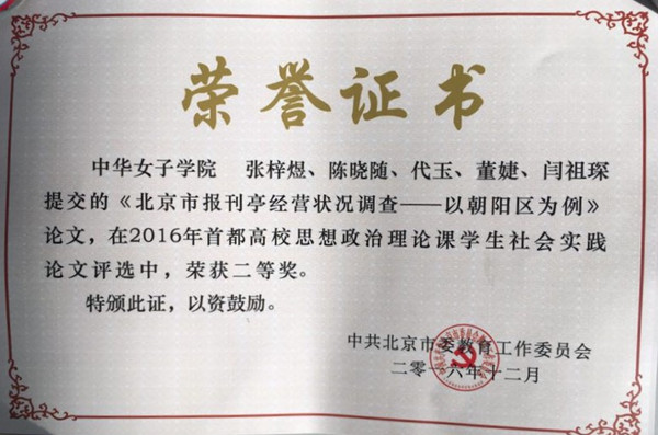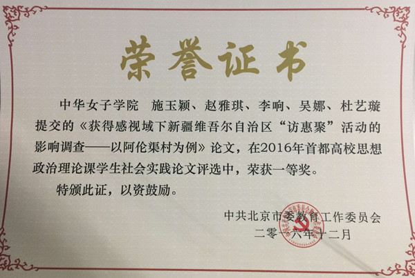 为贯彻教育部和北京市关于加强思想政治理论课建设的精神,充分发挥社会实践在思想政治理论课教学中的作用,引导学生在实践中深化理论认识,推进完善思想政治理论课实践教学机制,我校思想政治理论教学部继续积极组织学生参加思政课社会实践调研活动,并选报优秀学生论文参加首都高校思想政治理论课学生社会实践优秀论文评选。经过评选,我校刘旸老师指导的《获得感视域下新疆维吾尔自治区“访惠聚”活动的影响调查——以阿伦渠村为例》一文获北京市一等奖,苗伟东老师老师指导的《北京市报刊亭经营状况调查——以朝阳区为例》一文获得北京市二等奖。