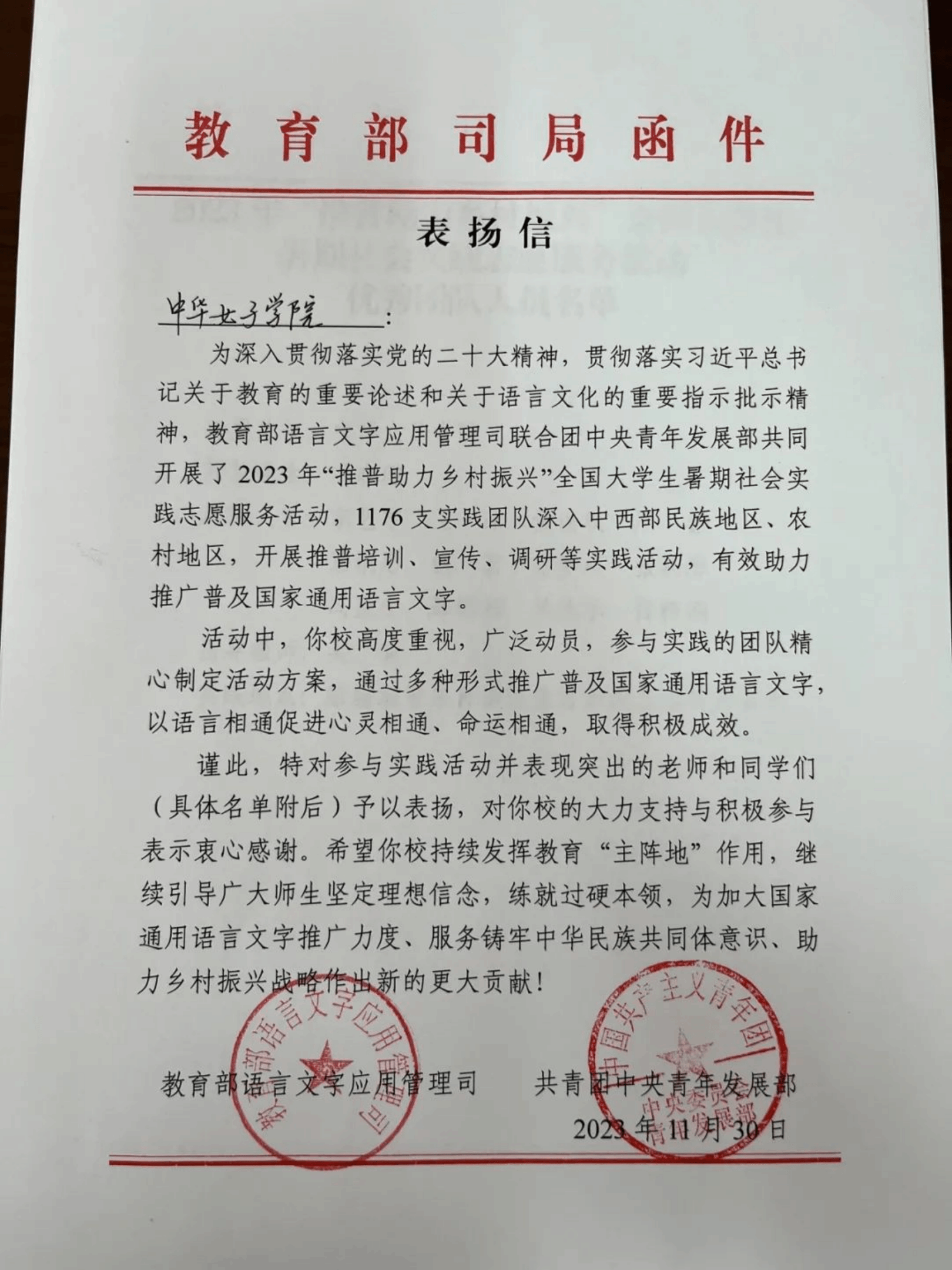 近日,教育部语言文字应用管理司、共青团中央青年发展部联合向我校发来表扬信,对我校石榴籽“悦”读推普团在2023年“推普助力乡村振兴”全国大学生暑期社会实践志愿服务活动中的突出表现给予了高度的评价。2023年“推普助力乡村振兴”全国大学生暑期社会实践志愿服务活动共有来自全国1056所高校的4123支团队报名参加,1176支团队入选,仅240支队伍被评选为“优秀团队”,由校团委支持、图书馆指导下成立的研读学社发起的石榴籽“悦”读推普团荣列其中。