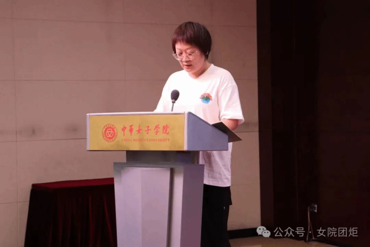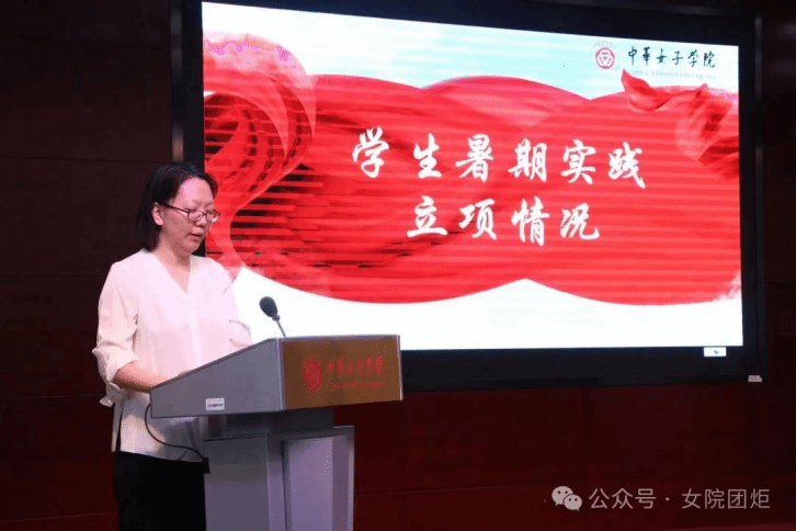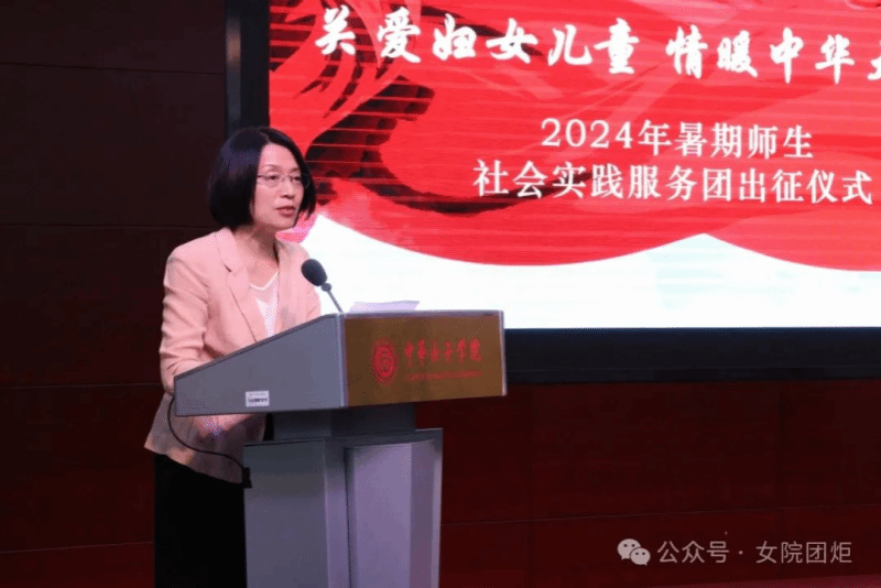 刘亚玫代表学校党委向各个暑期实践团授旗,勉励师生时刻牢记习近平总书记的殷殷嘱托,响应时代召唤,坚持学以致用,带着责任感、使命感投入到关爱妇女儿童社会实践中去,把青春奉献在党和国家最需要的地方,用实际行动诠释“请党放心,强国有我”的青春誓言。