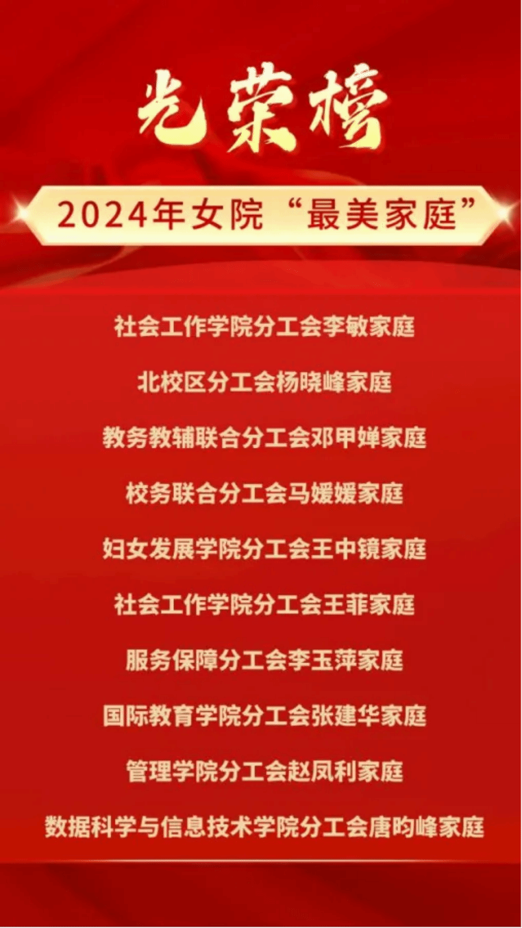 5月15日,我校揭晓了2024年女院十大“最美家庭”。10个家庭名单如下: