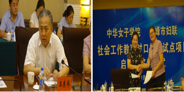 活动上,刘梦代表中国社工教育协会和中华女子学院,对此次项目的正式启动表示祝贺,并对项目未来的开展和实施提出了要求和期望,希望通过中华女子学院与赤峰市妇联以及赤峰市相关部门的共同努力,为赤峰市培养一支具有社会工作专业社工理念与工作方法的基层扶贫工作队伍,促使这支队伍成为推动赤峰市社会工作专业实践和社会工作职业发展的中坚力量,推动赤峰市社会工作专业介入精准扶贫和高校社工专业教育等方面的突破和实践。刘梦以“社会工作与精准扶贫”为题,为参加活动的人员做了项目的第一次专业培训。赤峰市委副书记王东伟对此表示热烈的欢迎,同时也向我校参与人员介绍了赤峰市相关的基本情况。研究生处处长矫杨、赤峰市妇联主席袁文英代表双方单位签订了合作协议。