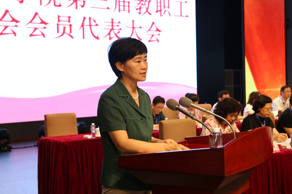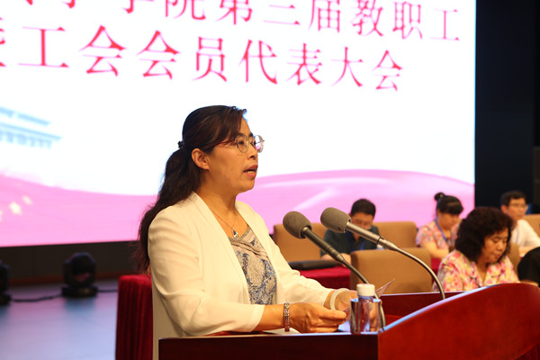 校工会常务副主席赵燕萍代表第二届教职工暨工会会员代表作题为《凝心聚力谋发展 竭诚服务促和谐 为建设特色鲜明的一流女子大学而努力奋斗》的工作报告。报告全面总结回顾了过去五年学校教代会、工会工作取得的成绩和基本经验:充分发挥参与职能,推进学校民主管理;努力搭建平台,助力教职工成长;大力弘扬主旋律传播正能量,丰富教职工文化生活;履行工会基本职责,维护教职工各项权益;加强自身建设,提高教代会工会工作水平。并对下一届教代会执委会和工会委员会提出了中肯的工作建议:全面落实十九大精神,不断加强民主建设;紧紧围绕学校中心工作,全力助推学校改革发展;继续完善维权机制,精准服务教职工需求;不断创新工作思路,努力提升整体工作水平。