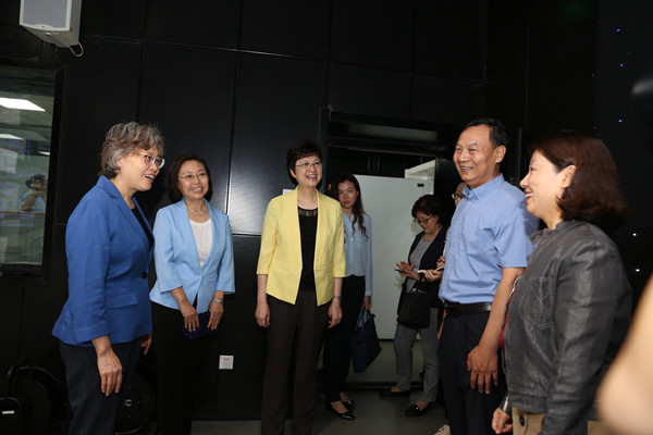 在文化传播学院演播室,黄晓薇一行了解了演播室在专业教学中发挥的作用和承担的教学任务,观看了学生主持、制作全国妇联女性之声《新闻联播》节目的现场,黄晓薇说:“要办好女性之声,引领广大妇女听党话跟党走。”