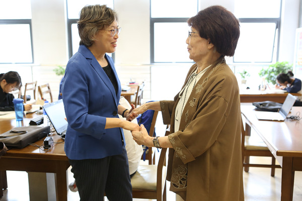 参观结束后,黄晓薇看望了学校第一届优秀毕业生、新中国第一代著名播音员葛兰教授,关切地询问了她的生活工作情况。黄晓薇还亲切慰问了正在办理新生入学手续的师生,与学校师德标兵、师德先进个人、德育先进个人代表亲切交流,向大家致以节日问候和祝福,并代表全国妇联党组、书记处向学校赠送了节日慰问金。