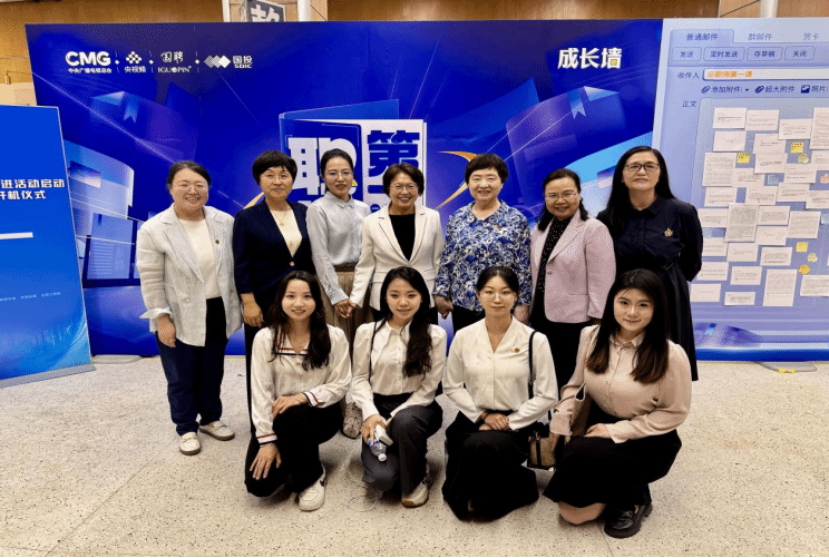 6名女院师生代表参加“国聘行动2024”就业促进活动启动暨《职场第一课》开机仪式。活动结束后,黄晓薇与同学们亲切交流,勉励同学们脚踏实地、励志追梦,到祖国和社会需要的地方担当作为,在平凡岗位上笃定进取、闪闪发光。
