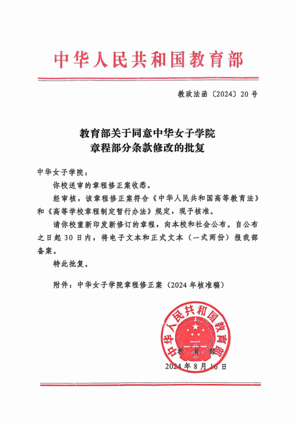 近日,我校收到《教育部关于同意中华女子学院章程部分条款修改的批复》,同意学校章程修正案,要求向本校和社会公布。