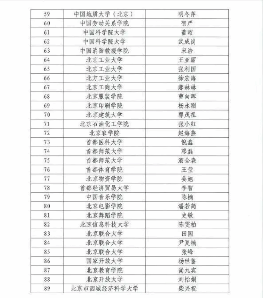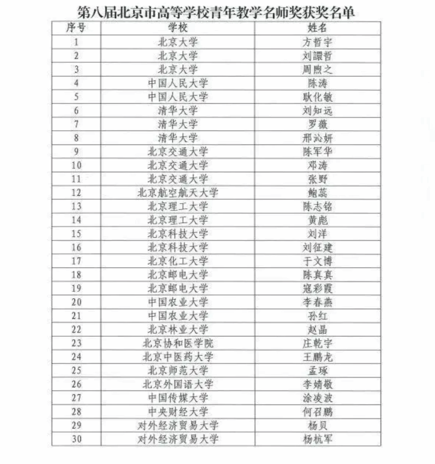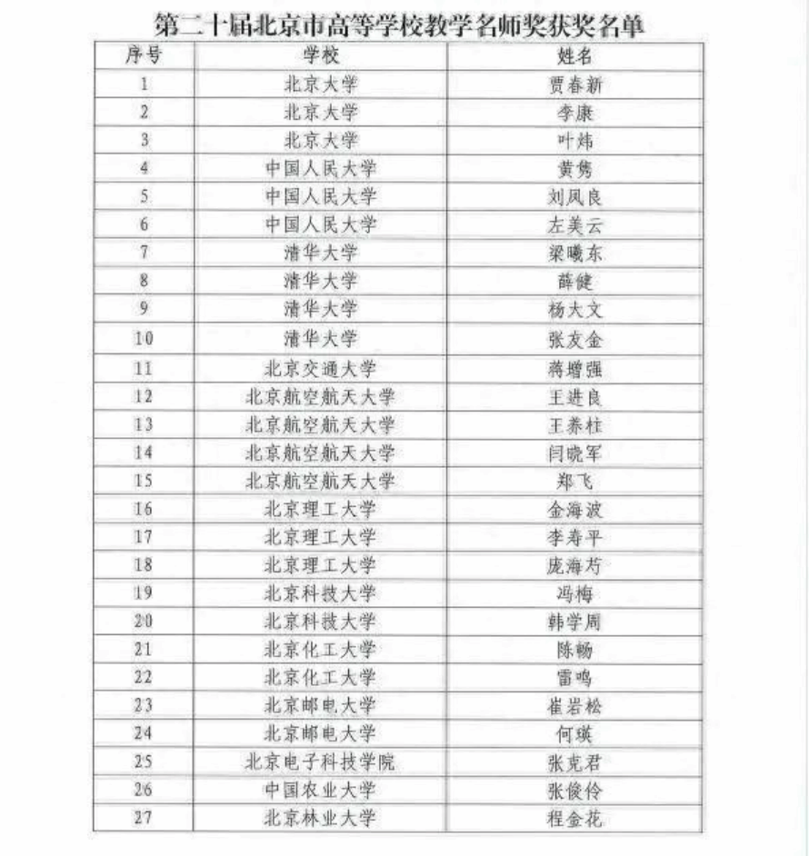 近日,北京市教委网站公布2024年度北京市高等学校教学名师奖获奖名单。经学校推荐、评审专家组评议、评审委员会投票、市教委审核并公示,决定授予北京大学贾春新等89名教师第二十届北京市高等学校教学名师奖、清华大学刘知远等75名教师第八届北京市高等学校青年教学名师奖。