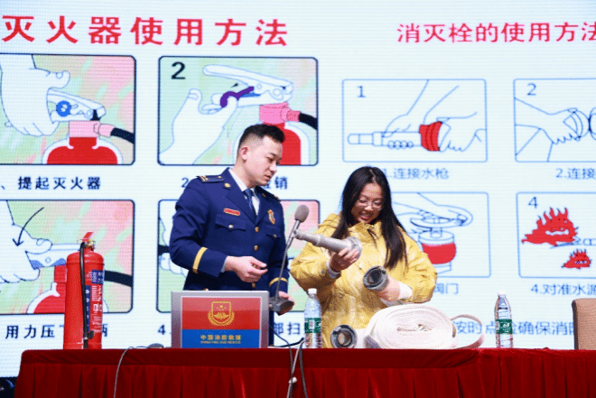 讲座中,王奇峰副站长以丰富的专业知识和实践经验,围绕消防常识、防火技巧、灭火方法及火场逃生策略等多个方面进行了深入讲解。他结合生动案例,剖析了火灾的成因与危害,使同学们对消防安全有了更加直观和深刻的认识。同时,他还现场演示了灭火器、安全救生绳等应急装备的正确使用方法,并邀请同学上台进行实操练习。