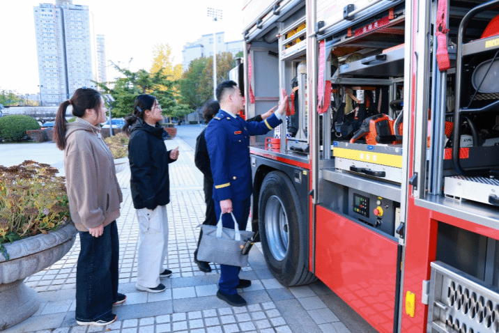 讲座结束后,同学们近距离参观了消防车,王奇峰副站长耐心细致地一一解答同学们的问题。