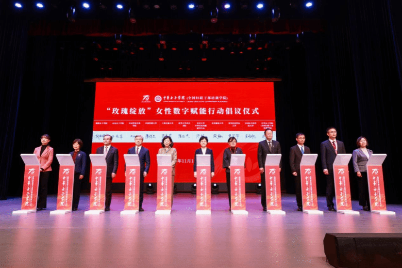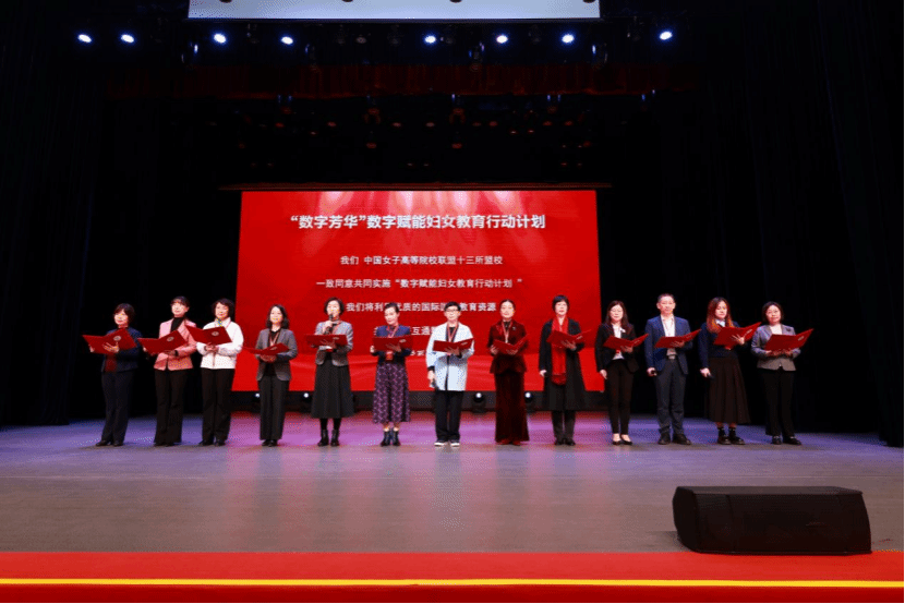 为落实习近平总书记关于解决性别数字鸿沟的重要讲话精神,中国女子高等院校联盟13所院校,携手8所高校,共同发布“玫瑰绽放”女性数字赋能行动倡议,启动“数字芳华”数字赋能妇女教育行动计划,以教育之力助力女性成长,以数字发展照亮女性未来。清华大学求真书院副院长陈志杰、北京大学中外妇女问题研究中心副主任佟新、上海交通大学妇女工作委员会常务副主任苏卓君、北京邮电大学党委书记续梅、中国传媒大学党委书记廖祥忠、对外经济贸易大学党委书记黄宝印、中国劳动关系学院党委书记刘向兵、中国社会科学院大学党委书记崔唯航、山东女子学院党委书记吕晓黎、湖南女子学院党委副书记、校长何旭娟等兄弟姊妹高校负责人参与、见证倡议发布和计划启动仪式。