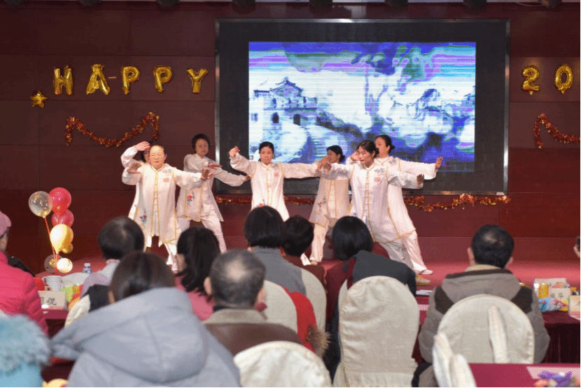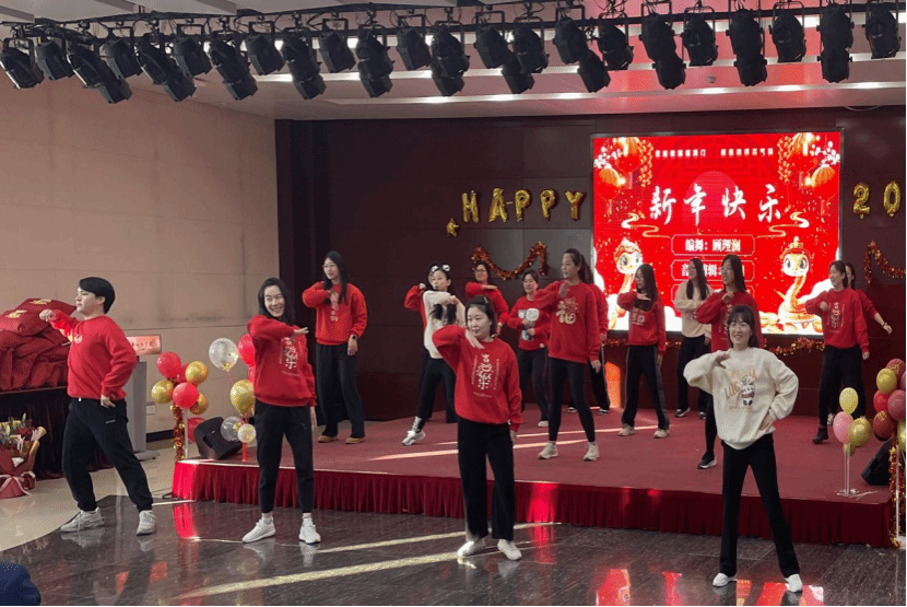 联欢会现场气氛热烈如火。在熟悉欢快的《新年快乐》旋律中,教工文体协会快乐减脂团成员活力登场,她们脸上洋溢着喜悦,步伐灵动矫健,和着音乐节奏,奏响新年序章。