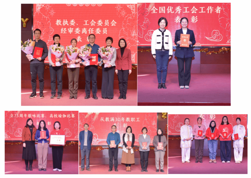 赵浩主席总结了工会2024年重点工作并为教执委、工会委员会和经审委离任委员颁奖。邢慧丽副书记、叶水平常委为全国优秀工会工作者和2024年从教满30年教职工颁奖。工会专兼职副主席陈丽君、张小红为中直机关歌咏比赛和高校瑜伽比赛获奖代表以及优秀文体社团颁奖。