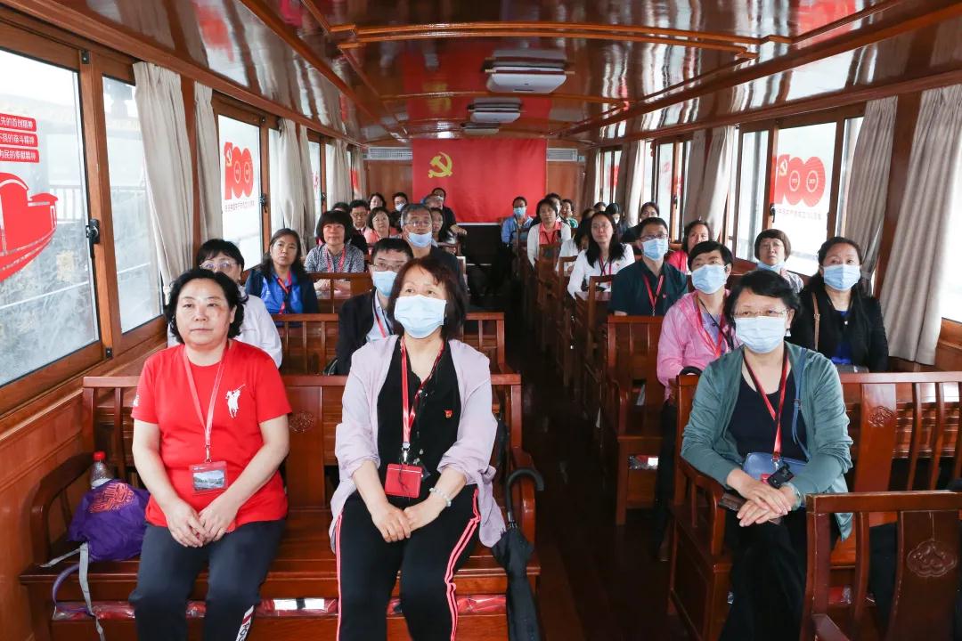 5月26日下午,全体学员前往嘉兴南湖,重走一大路,瞻仰中国共产党第一次全国代表大会召开的会址——红船。学员在南湖一条小船上观看纪录片,学习中国共产党第一次全国代表大会召开的光辉历史,王京霞带领全体党员重温入党誓词,学习领会“开天辟地、敢为人先的首创精神,坚定理想、百折不挠的奋斗精神,立党为公、忠诚为民的奉献精神”的红船精神内涵。