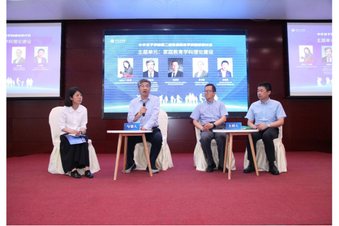 在家庭教育学科理论建设主题单元,南京师范大学项贤明教授、北京师范大学余清臣教授分别作了主题报告。儿童发展与教育学院院长陈辉主持该主题的与谈环节,缪建东教授与几位专家进行了深入探讨。