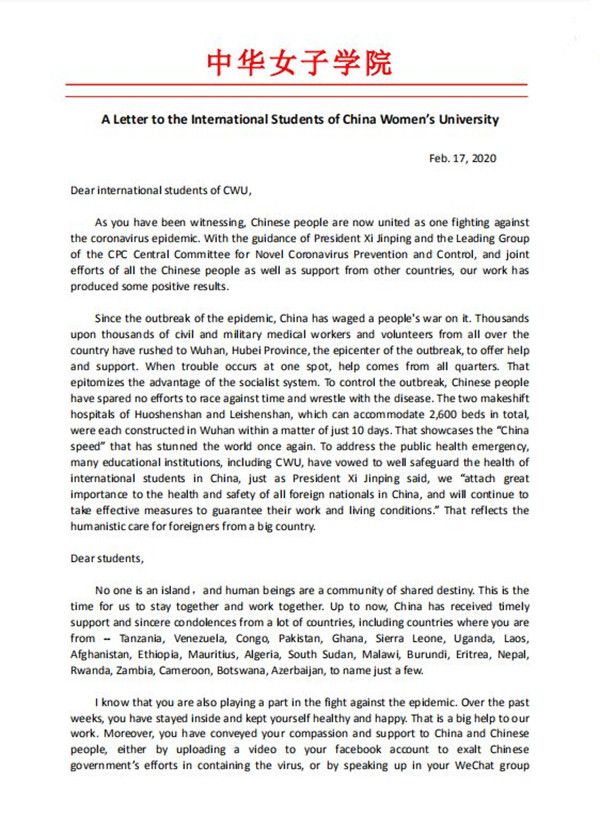 新冠肺炎疫情全面爆发之时,正值各高校放寒假之际。中华女子学院来自亚非拉16个国家的38位社会工作专业国际硕士研究生班学员选择留在中国。艰难时刻,她们主动加入中国防疫抗疫的大军,与学校师生员工站在一起,以高...
